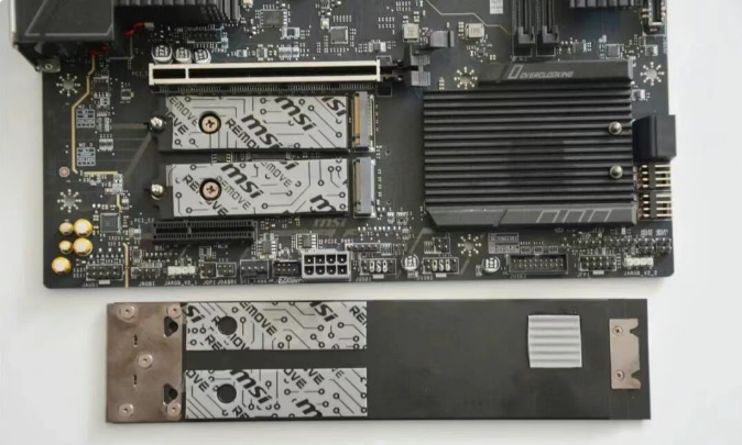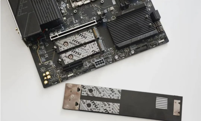 正面三组中,包含两组PCIe 5.0插槽,和一组PCIe 4.0插槽,并且都使用双面导热垫设计,支持装甲和SSD快拆。