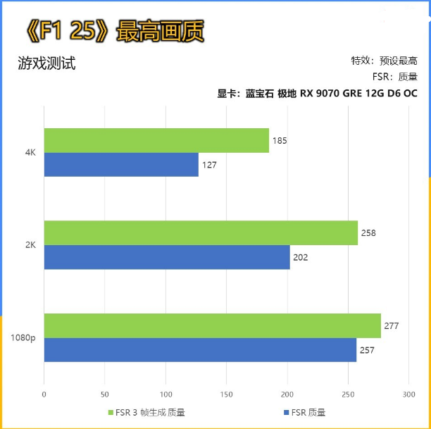 在纯光栅化游戏测试中,蓝宝石 极地 RX 9070 GRE 12G D6 OC在4K分辨率下,开启FSR 3帧生成能够达到185帧的电竞级帧率。