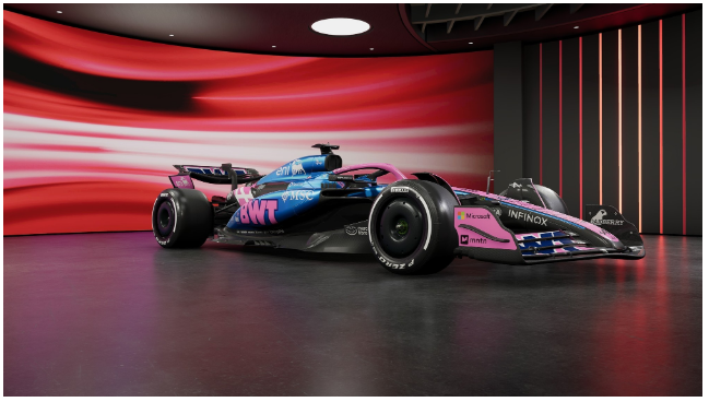 F1赛车整体采用碳纤与漆面,在阳光下反射率较高,原本轮胎处漆黑的光线,在开启光追+路径追踪后,被间接照明能够清晰显示与车身的连接结构。