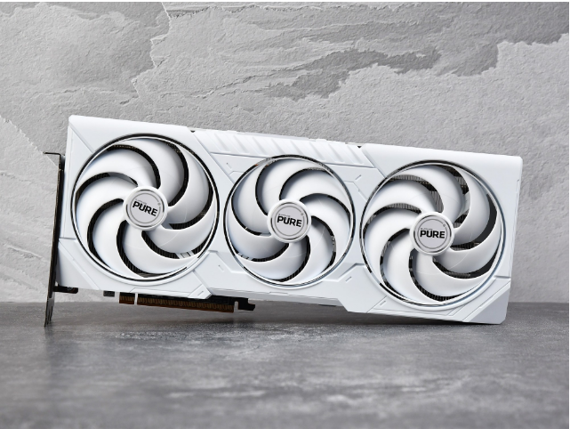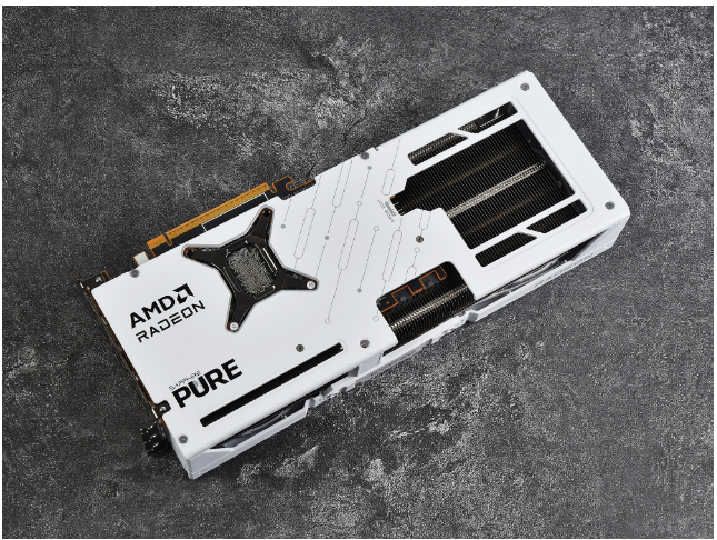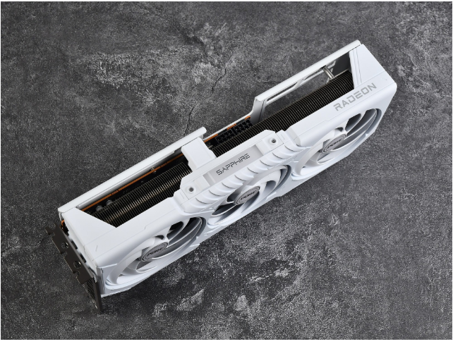 蓝宝石 极地 RX 9070 GRE 12G D6 OC卡身整体为“雪白色”,尺寸为320×120.25×61.6mm,采用三风扇全尺寸设计,占用3槽空间。主动散热部分采用2大1小的3个7叶飞翼轴流风扇,搭配双滚珠轴承结构,可高效散热并延长风扇使用寿命。
