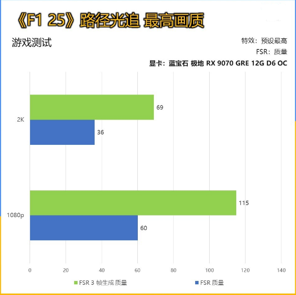 另外值得一提的是,蓝宝石 极地 RX 9070 GRE 12G D6 OC凭借RDNA4架构在光线追踪中的进步,《F1 25》即便光线追踪全开,也能在4K分辨率下流畅运行。虽然赛车游戏对帧数要求相对较低,但相比自身上一代产品的提升是巨大的。