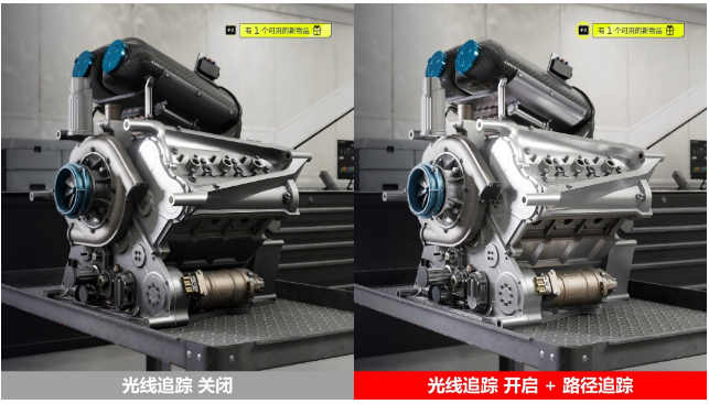 在车库中,赛车发动机为纯金属材质,对光的反射率较高,这里光追表现与上面车库地面的正好相反,开启光追+路径追踪后,即使是无直射光源的暗面,通过间接照明也足够亮。而在光源直射面,甚至能感觉到强光带来的眩目,非常接近真实的材质表现。
