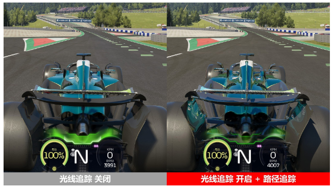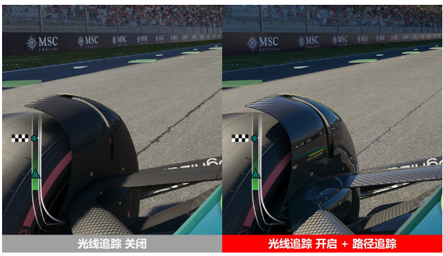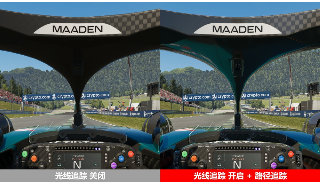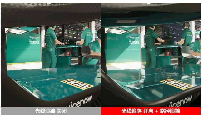 下面来看看《F1 25》在光线追踪关闭与全开下的画面表现差异。游戏中画质调节是实时的,且在车库中即可看出差异。