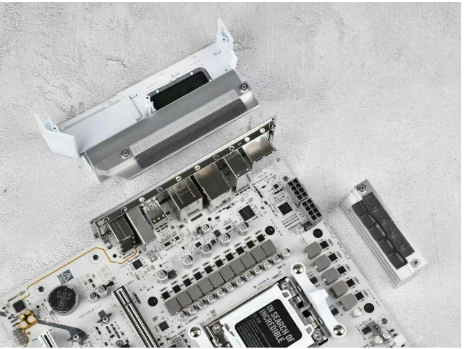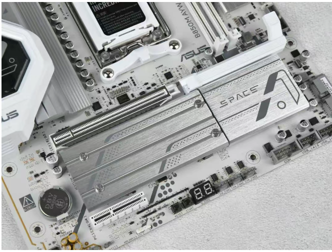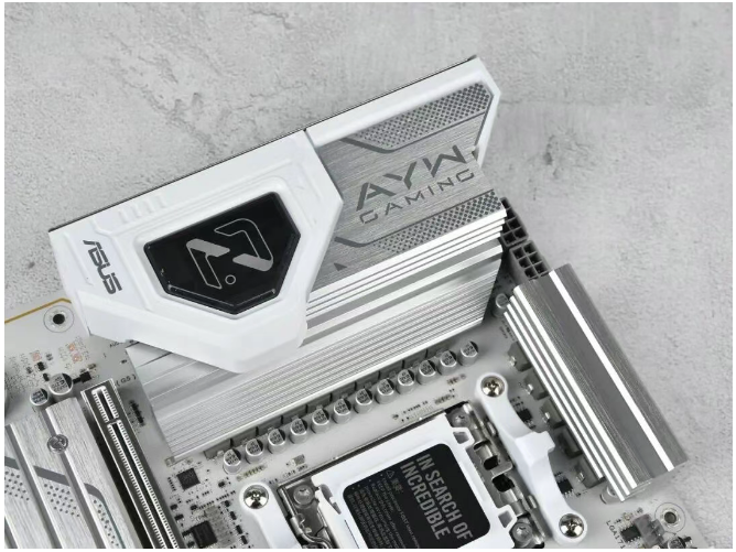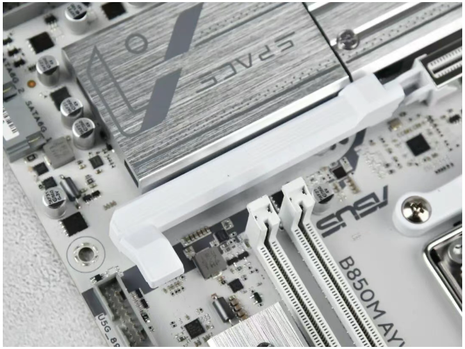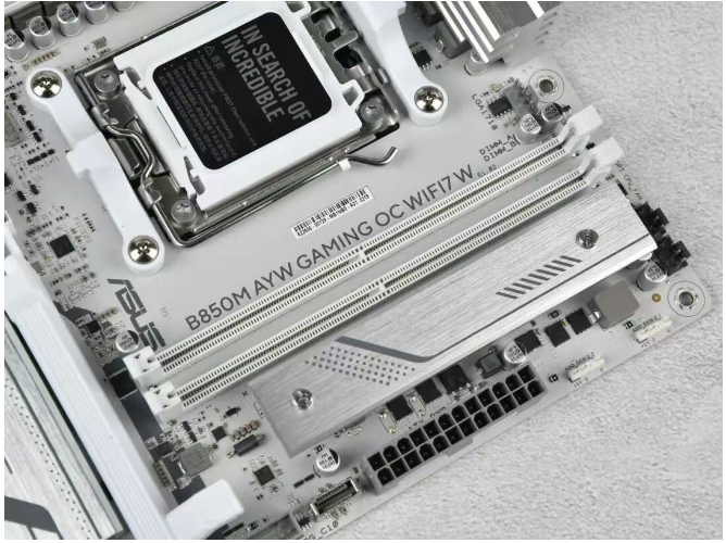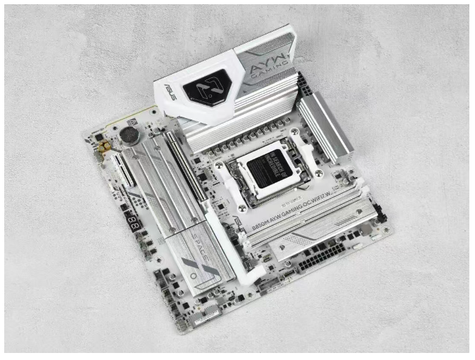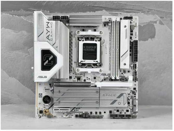 在外观设计上,华硕B850M AYW OC摒弃了AYW系列以往的风格,转而采用银白配色。经过工艺优化的白色PCB板,搭配更多白色与浅色系的插槽和接口件,整体视觉效果更和谐统一。