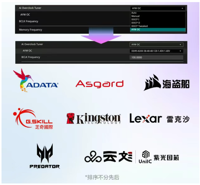如果是使用华硕官方推荐的内存品牌,还可开启AYW OC Profile一键超能模式,目前支持芝奇、雷克沙、海盗船等品牌,后续也将持续加入新的推荐内存品牌。