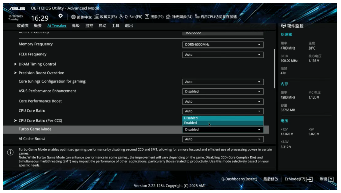 此外如果你使用的是锐龙 7 9800X3D这类具备X3D处理器,还可以在Ai Tweaker界面,开启Turbo Game模式。