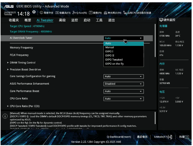 Ai Tweaker是华硕主板超频功能的入口,在这个界面中可以找到预设好的增强配置文件,如果选择EXPO Tweaker后,系统就会匹配硬件配置,来优化内存大小时序、频率等设置,让新手小白用户上手更容易。