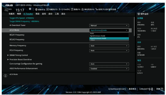 除此之外,这款主板具备异步时钟功能,也就是我们常说的超外频。在Ai Overclock Tuner开启Manusl选项后,我们可以在eCLK Mode(外频模式)中选择同步或者异步,尤其是选择异步后多出的BCLK 2选项,就让用户可以单独对CPU的基础频率进行调节。这也是这款主板的一大亮点。