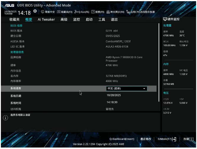 在概要窗口中我们可以直观的看到当前BIOS以及硬件的详细信息,如BIOS版本、CPU版本、内存容量、内存频率等信息。