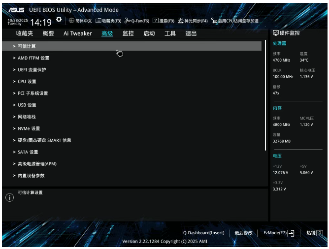 一款主板的性能优越与否,很大程度上都取决于主板BIOS的管理功能是否先进。华硕B850M AYW GAMING OC WIFI 7 W 主板的主板BIOS设置沿用该系列一贯的经典风格界面,且功能齐全。