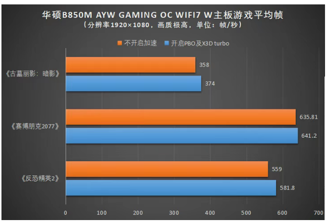 而在最低帧方面则有了明显的提升,尤其是《古墓丽影》的最低帧从266上涨到了308,《CS2》最低帧由268提升至287.8,这就证明游戏的下限有了明显的提升,这对于玩家尤其是竞技类网游玩家来说就能有更好的游戏体验。