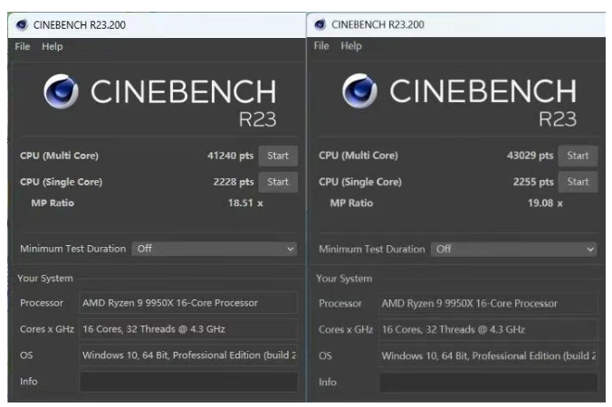 随后,我们进行了性能优化前后平台的理论性能表现测试,以CINEBENCH R23的分数为参考,因为9800X3D的X3D功能会影响多线程性能,所以这里我们改用锐龙99950X进行了测试。