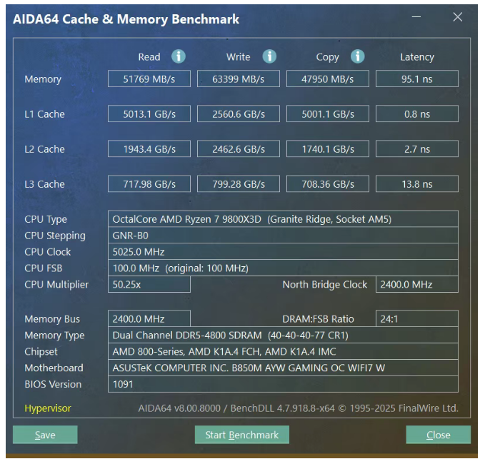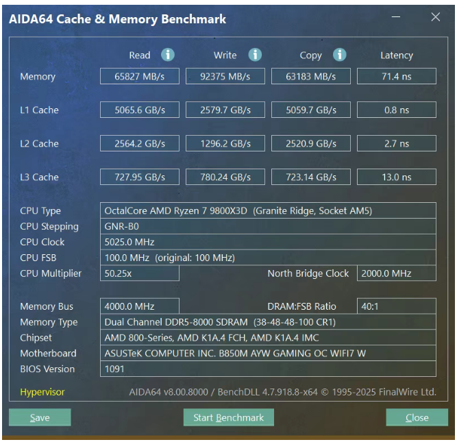 华硕B850M AYW GAMING OC WIFI 7 W主板再配合使用锐龙9000系列处理器时,支持将内存速率超频至8400MT/s,我们首先针对内存进行测试,测试软件为AIDA 64。