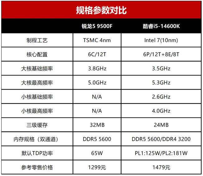 由于酷睿i5-14600K默认TDP已经高达125W,最高睿频功率更是高达181W,这对于主板供电、散热器和电源来说都提出了更高的要求,玩家不得不在这些方面投入更多的预算,导致整机成本增加。比如锐龙5 9500F使用盒装自带的原装散热器就可以了,酷睿i5-14600K盒装没送散热器不说,必须买高性能产品。另外锐龙5 9500F能搭配千元内的入门级B650,而为了性能充分释放,酷睿i5-14600K要搭千元价位的游戏主板才行,两者之间又有了将近300元的价差。
