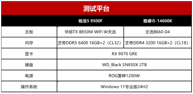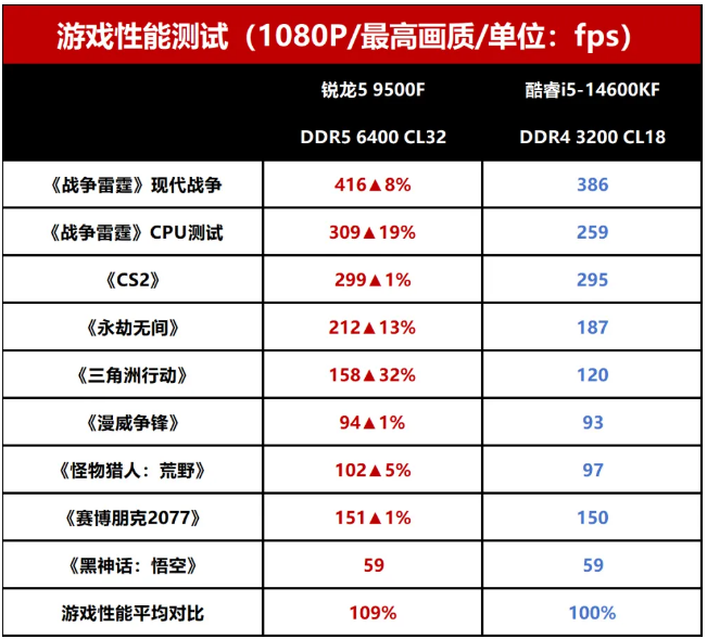 那么问题来了,搭配DDR4内存的酷睿i5-14600K平台和搭配DDR5内存的锐龙5 9500F究竟在性能上有多大的差距呢?接下来我们就用实际的游戏测试数据来说话。