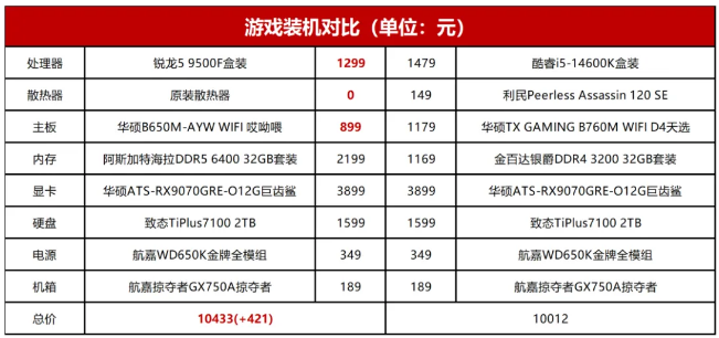 从我们列出的主流配置来看,锐龙5 9500F+DDR5的配置确实更贵,但是只贵了421元,这点差价对用户来说其实并不算太高。再结合DDR5带来的高带宽对游戏的加持,综合游戏体验更好,而且未来升级更平滑,成本也更低。所以酷睿i5-14600K+DDR4可以说是到手即落伍:性能没优势,升级也无潜力,为了节省这400多元确实不划算,锐龙5 9500F+DDR5才是当前中端一步到位的好选择。