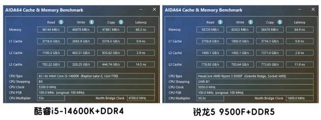因为频率上的较大差别,可以看到锐龙5 9500F+DDR5在理论成绩上明显优于酷睿i5-14600K+DDR4平台。在《AIDA 64》的内存性能测试中,锐龙5 9500F+DDR5内存读取带宽、写入带宽、拷贝带宽方面分别领先对手27.25%、78.82%、18%,差距明显。