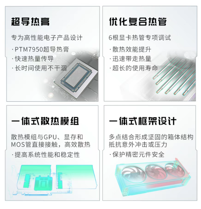 强劲性能,散热与稳定双重保障,RX 9070 XT搭载AMD Radeon架构,加速频率高达3060MHz,配备16GB GDDR6显存。性能测试显示,其与同级竞品实力相当,适合游戏、内容创作及超频等高负载场景。散热方面,显卡采用6根优化复合热管、一体式散热模组与PTM7950超导热膏,配合飞翼轴流扇与双滚珠轴承风扇,实现高效静音散热。高强度冷轧钢框架与一体式结构设计进一步增强显卡刚性,保护内部元件。