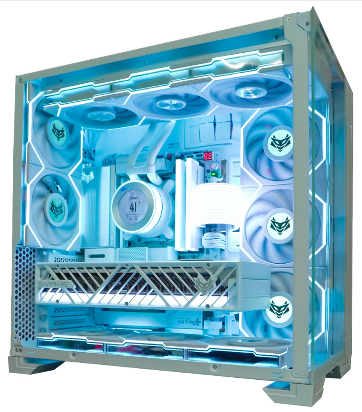 双色设计,满足个性化装机需求,蓝宝石NITRO+ 氮动 RX 9070 XT Phantomlink采用深色主题设计,搭配灵动岛RGB光效系统,低调中彰显性能实力。蓝宝石NITRO+ 氮动 RX 9070 XT Phantomlink 极光版(PE)采用专属雪白配色,整卡外观及风扇网罩均采用雪白烤漆工艺,内部框架为银色金属质感,清新亮眼,适合白色主题装机。搭配蓝宝石新推出的X870E PhontomLink氮动极光主板更是完美,主机内部走线几乎全部隐藏,白色海景房主机简直太完美,同样该显卡还适配华硕背插2.5标准的主板,让玩家轻松理线。