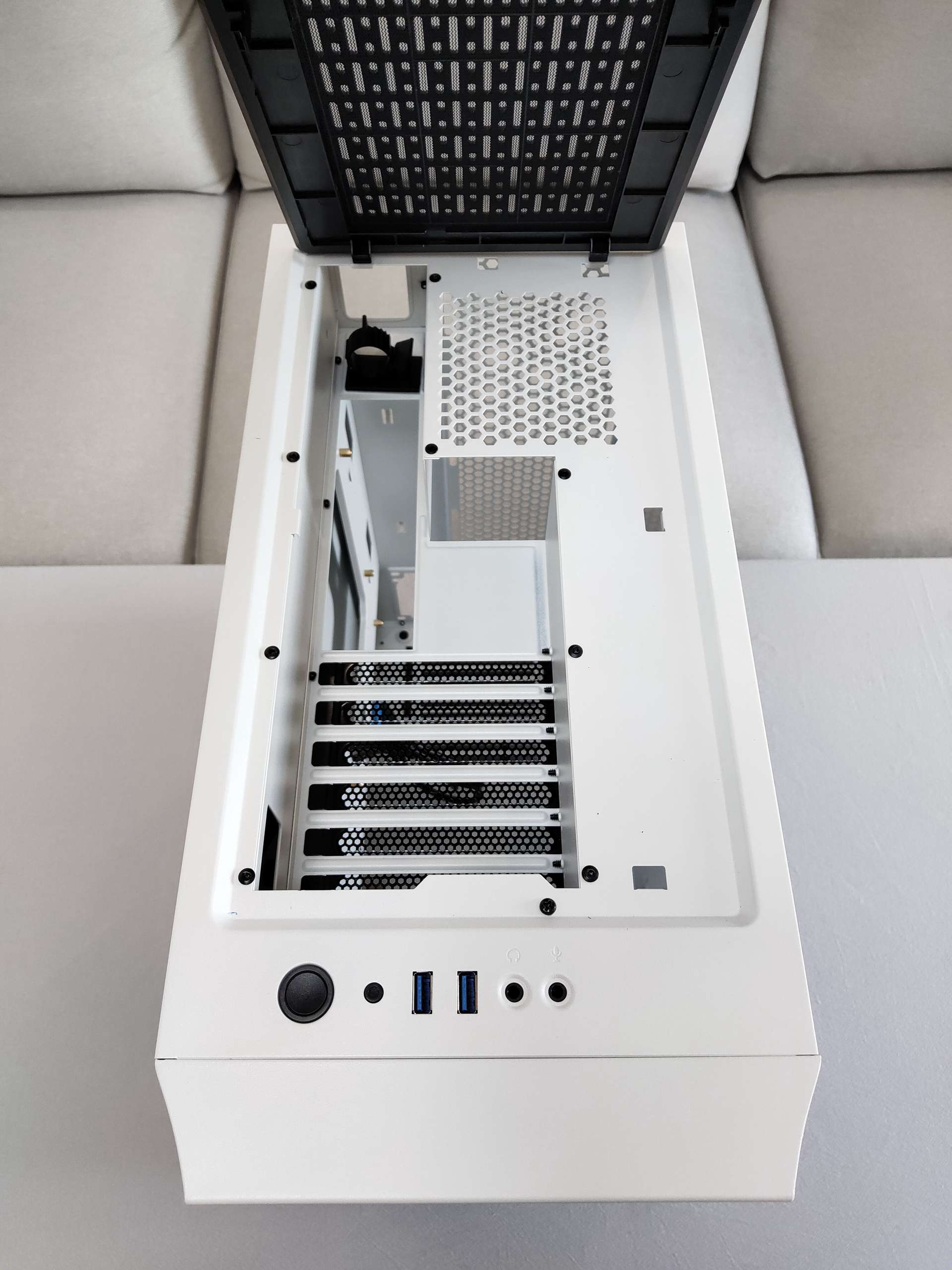 “破晓X”顶部I/O接口除了常见的开关重启耳麦之类,USB使用到了两个USB3.0接口,取代了传统的USB2.0,顶部的防尘网是卡扣式,从前部掀开的方式打开,没有使用磁吸式,卡扣有点紧,在只接一个显示器的时候,HDMI连接线固定在大走线孔旁的小孔已经很稳了,完全不会因为弯曲走线而顶起防尘网。